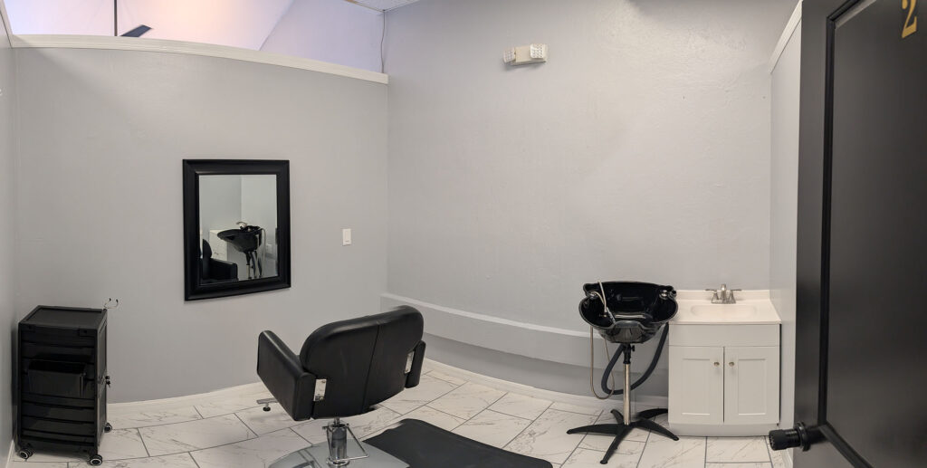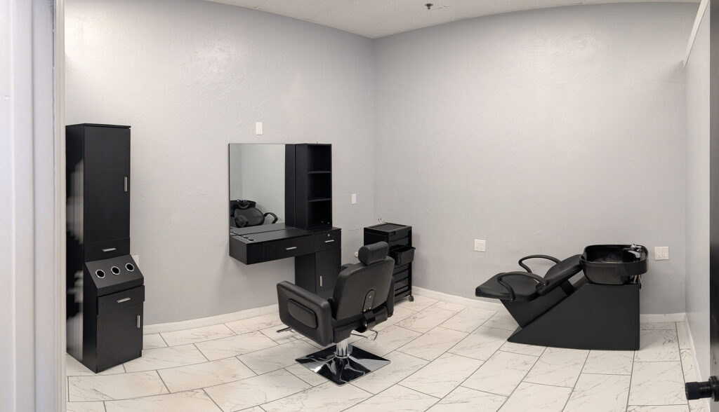 This suite comes equipped with a salon chair, mirror, storage space, a shampoo chair instead of a sink vanity, and a salon station. Ideal for daily, weekly, monthly, and annual rental. Approximately 100 square feet. Save money by sharing your suite with a friend or colleague!