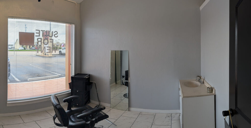This suite comes equipped with a salon chair, sink vanity, and a mirror. Ideal for weekly, monthly, and annual rental. Approximately 100 square feet. Save money by sharing your suite with a friend or colleague!