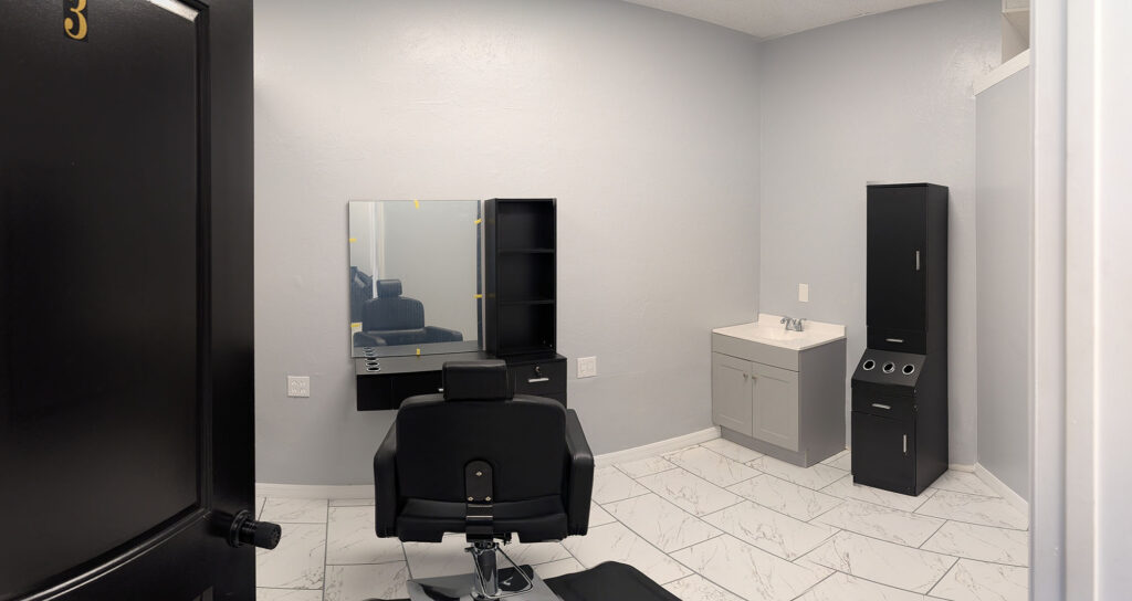 This suite comes equipped with a salon chair, sink vanity, mirror, and storage space. Ideal for daily, weekly, monthly, and annual rental. Approximately 100 square feet. Save money by sharing your suite with a friend or colleague!